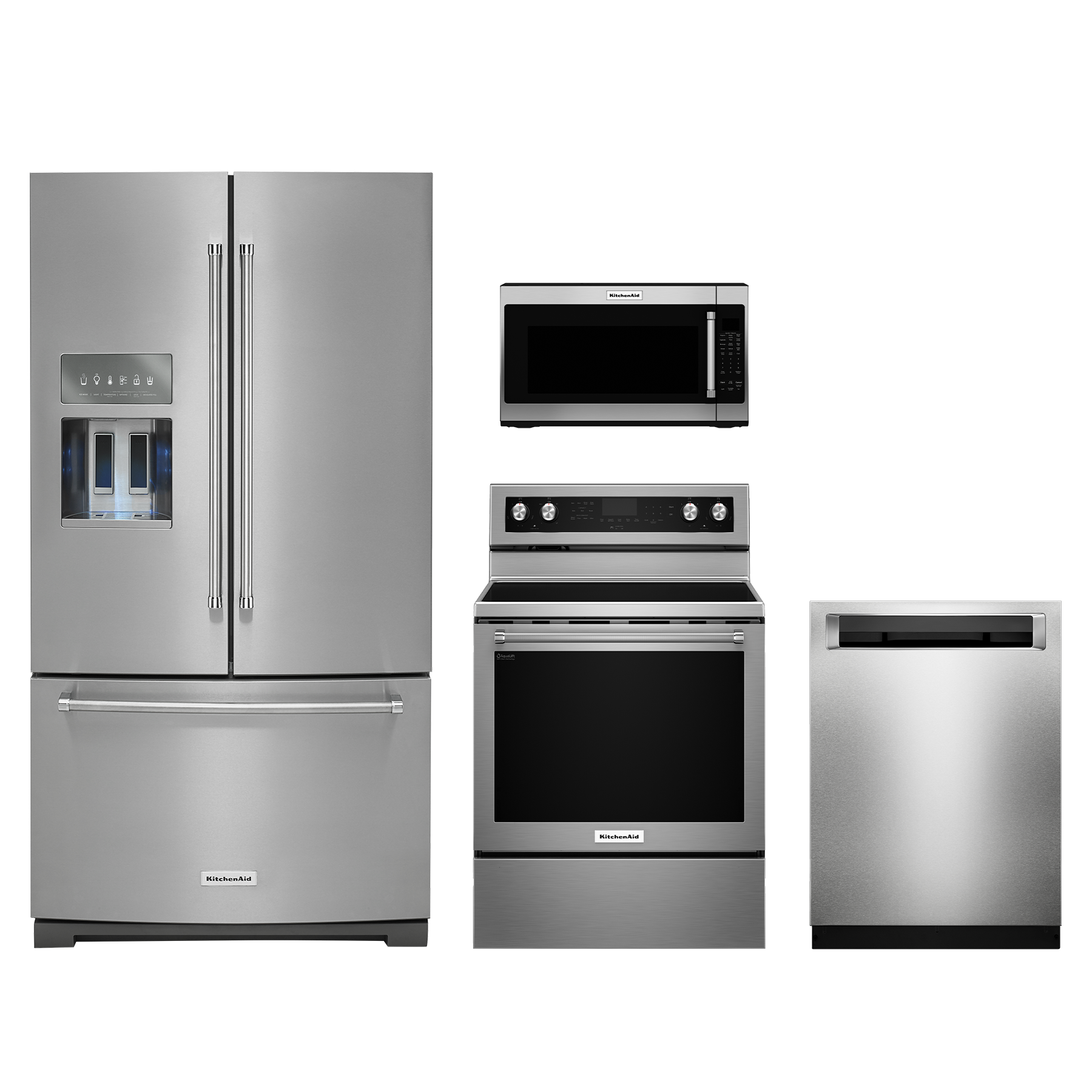 KitchenAid® 4 Piece Kitchen Package-Stainless Steel with french door refrigerator, free standing electric range, built in dishwasher and over the range microwaveRead More